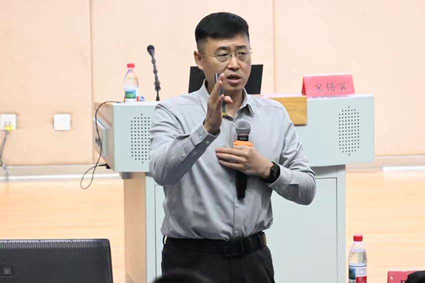 宋锡滨先生任山东国瓷功能材料股份有限公司党委书记、董事,先后申请国家发明专利200余项,主持参与了国际标准5项,国家标准、行业和团体标准30余项,曾获中国工业大奖、国家科学技术进步奖等奖项。同学们用热烈的掌声欢迎宋老师上台分享。