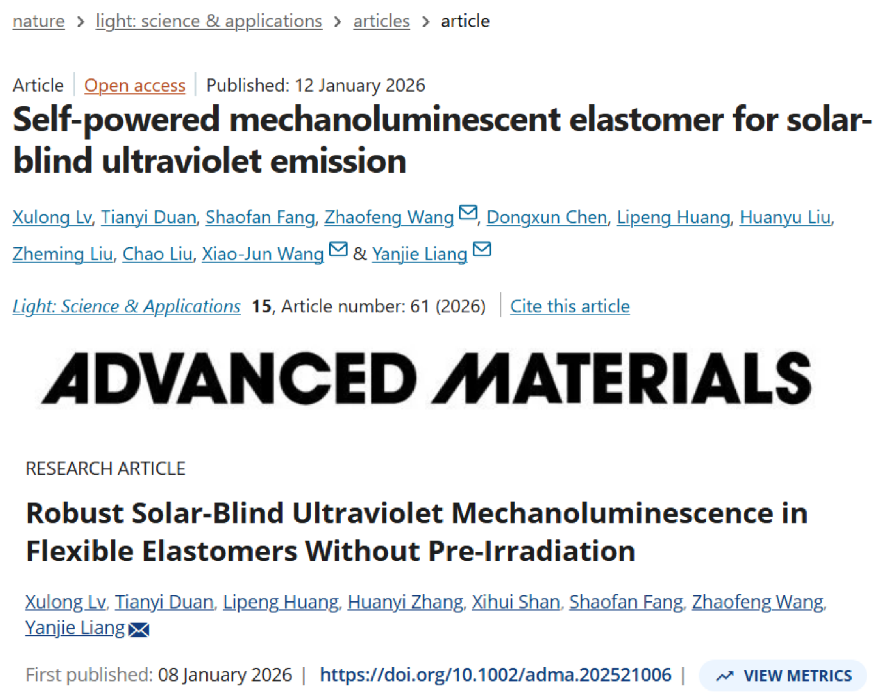 近日,山东大学材料科学与工程学院梁延杰教授课题组在无需预辐照的自供能自恢复日盲紫外力致发光新材料研究领域取得系列进展。相关研究结果分别以“Self-powered mechanoluminescent elastomer for solar-blind ultraviolet emission”和“Robust solar-blind ultraviolet mechanoluminescence in flexible elastomers without pre-irradiation”为题发表在光学顶刊、Nature子刊Light: Science & Applications(中科院1区Top期刊, IF: 23.4)和材料科学顶刊Advanced Materials(中科院1区Top期刊,IF: 26.8)。山东大学材料科学与工程学院博士研究生吕旭龙为论文第一作者,山东大学分别为第一通讯作者单位和唯一通讯作者单位,材料科学与工程学院梁延杰教授为通讯作者。