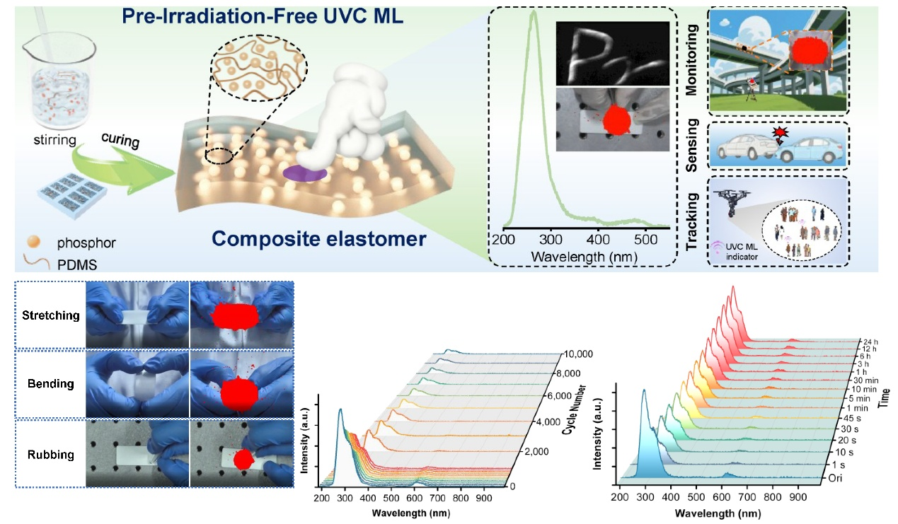针对上述问题,团队创新性地将所设计合成的日盲紫外荧光材料与商用聚二甲基硅氧烷(PDMS)复合,开发出高性能、自供能、自恢复日盲紫外力致发光弹性体新材料(图1)。在无需高能光预辐照的前提下,复合弹性体材料在多种机械刺激(拉伸、弯折、摩擦、撞击等)下均可产生峰值位于270 nm左右的宽带强日盲紫外力致发光(图中红色区域代表人眼不可见的日盲紫外发光)。该复合弹性体材料同时具有优异的循环稳定性和快速高效的自恢复特性,在10,000次快速连续拉伸循环测试中,力致发光信号始终可被日盲紫外相机清晰捕获。此外,在机械刺激停止后,体系中的界面相互作用能够产生自我修复,从而赋予材料优异的自恢复性能。本研究通过系统的实验与理论分析阐明了复合弹性体材料的自供能自恢复日盲紫外力致发光机理。最后,基于日盲紫外光的环境光无干扰和高光子能量特性,本研究进一步展示了该弹性体材料在自供能光学成像标记、光学定位与追踪、先进应力传感和微生物灭活等领域的应用潜力。