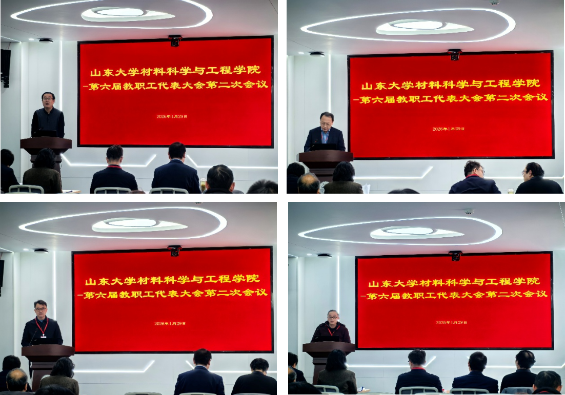 1月29日下午,材料学院第六届教职工代表大会第二次会议在千佛山校区主楼举行。学校工会主席罗超、学院党委书记吕宇鹏讲话,院长周传健作学院工作报告,副院长毕见强作提案落实工作报告。开幕式由学院党委副书记、工会主席董兴主持。学院教代会代表和各中心负责人等40多人参加了会议。